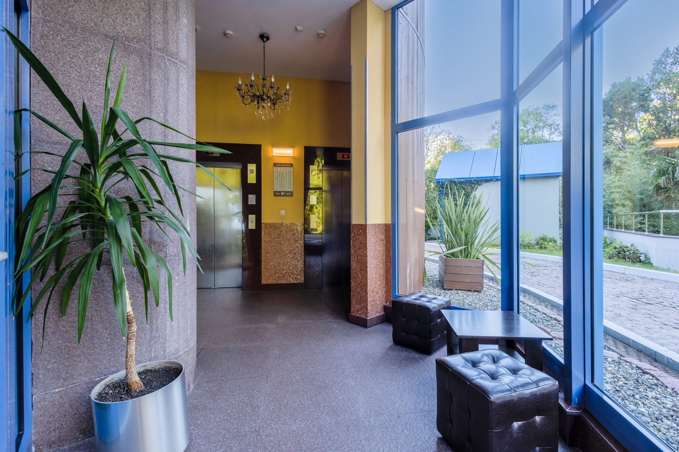 - 5 бесшумных панорамных лифтов класса люкс от финской компании KONE;