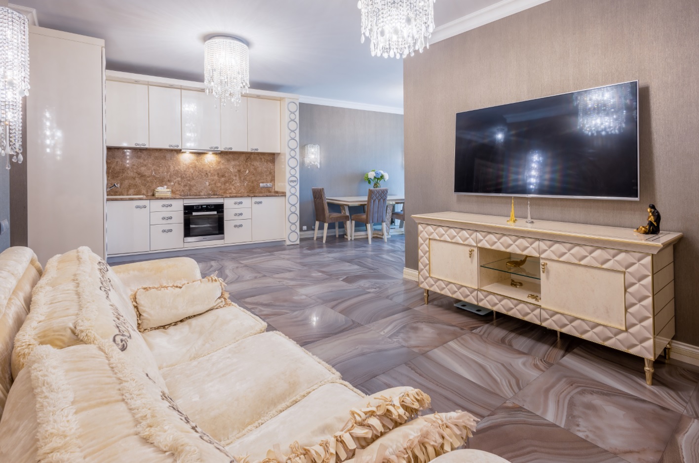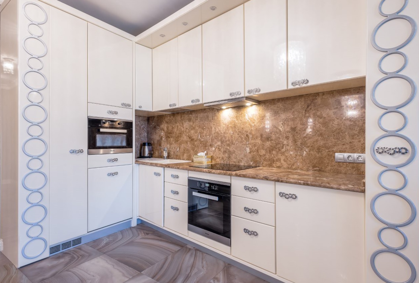 Квартира, общей площадью 92 кв. м (с учетом площади лоджий - 5,4 кв.м), с объединенной кухней-гостиной и 2 отдельными спальнями улучшенной планировки, cпанорамными окнами Schüco (алюминиевый профиль), роскошной мебелью и элитной бытовой техникой, расположена на 3-м этаже клубного дома.