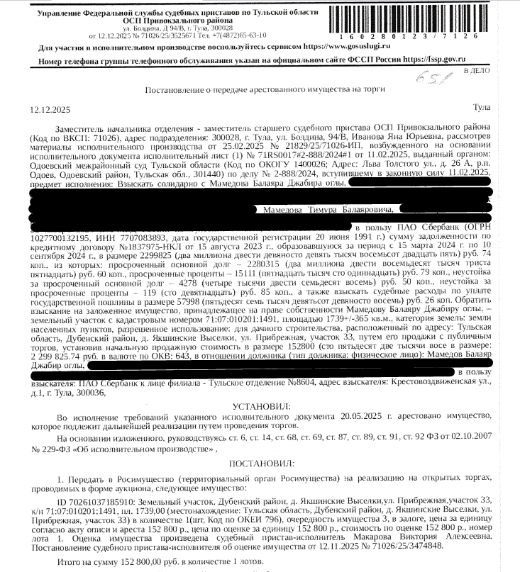 постановление заместителя начальника отделения – заместителя старшего судебного пристава ОСП Привокзального района УФССП России по Тульской области Ивановой Я.Ю.