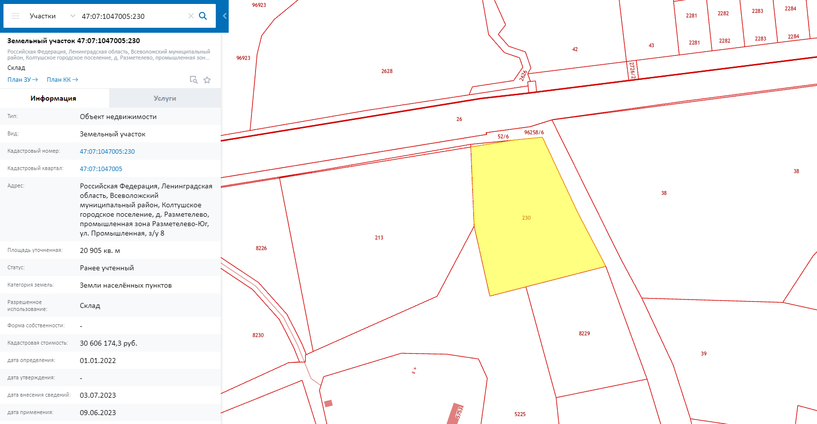 Аренда земельного участка, кадастровый номер 47:07:1047005:230, расположенного по адресу: Российская Федерация, Ленинградская область, Всеволожский муниципальный район, Колтушское городское поселение, д. Разметелево, промышленная зона Разметелево-Юг, ул. Промышленная, з/у 8