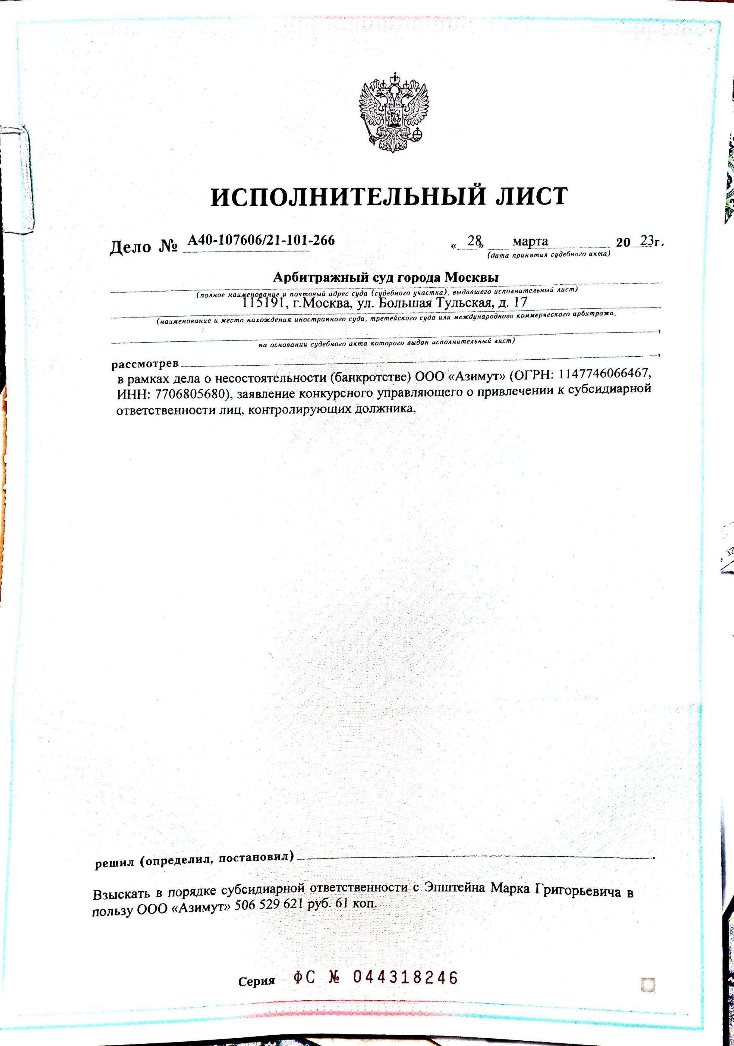| Наименование суда | АРБИТРАЖНЫМ СУДОМ ГОРОДА МОСКВЫ |