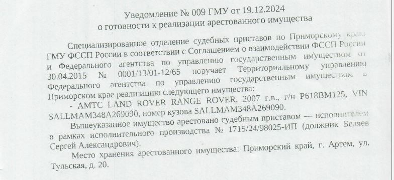 на основании постановления судебного пристава – исполнителя СОСП по Приморскому краю Хисамовой Анастасии Романовны +7(495)249-3051 от 19.12.2024 г. № 98025/24/262690, подвергнутое аресту по исполнительному производству 1715/24/98025-ИП от 15.01.2024