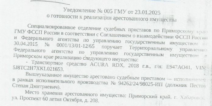 на основании постановления судебного пристава – исполнителя СОСП по Приморскому краю Калашниковой Екатерины Сергеевны +7(495)249-3051 от 23.01.2025 г. № 98025/25/7229, подвергнутое аресту по исполнительному производству № 94262/24/98025-ИП от 16.05.2024